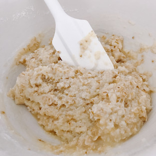 ① のボールに炭酸、小麦粉、オートミール、ココナッツを入れて混ぜる。